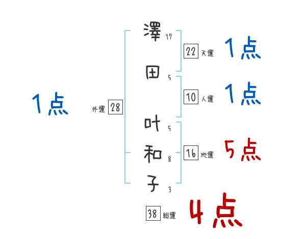 外運![]() | 澤田叶和子さんの外運は28画の1つ星!家庭環境に注意。スポーツで活躍できる能力があるかも。 生活面を象徴する運勢です。外部から受ける影響力を表し、結婚運、家庭運や職場、環境への順応性を表します。 |