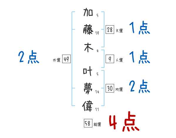 総運![]() | 加藤木叶夢偉さんの総運は58画の4つ星!安定した生活。大器晩成タイプ。 あなたの人生を表す1番重要な運勢です。生涯を通じて影響する総合運となり、主に50歳以降の晩年期に影響を及ぼします。 |