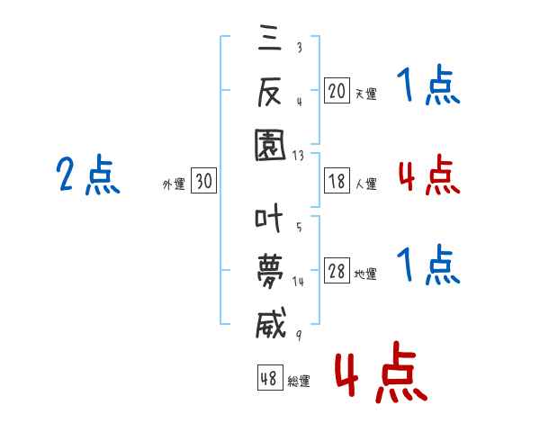 外運![]() | 三反園叶夢威さんの外運は30画の2つ星!浮き沈みの激しさに注意しましょう。 生活面を象徴する運勢です。外部から受ける影響力を表し、結婚運、家庭運や職場、環境への順応性を表します。 |