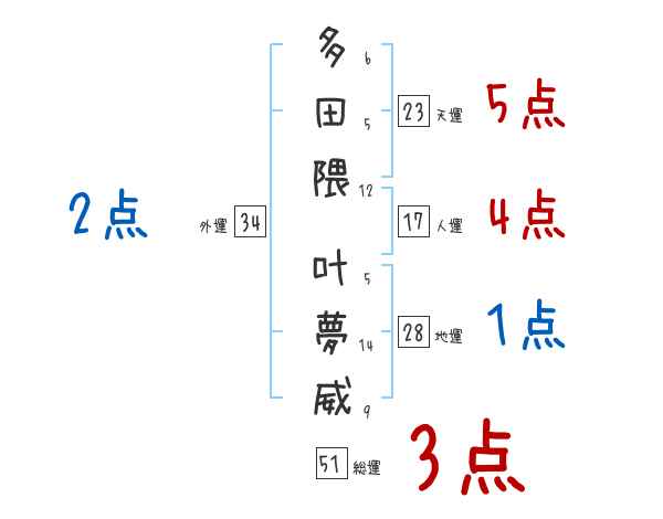 天運![]() | 多田隈叶夢威さんの天運は23画の5つ星!想像力に優れ活力がある。一代で成功し名誉を手に入れる。 家系が持つ宿命的な運勢を表します。祖先から受け継いだ苗字ですので自分の力が及びません。家柄を象徴します。 |