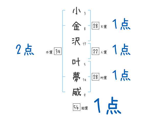 天運![]() | 小金沢叶夢威さんの天運は28画の1つ星!家庭環境に注意。スポーツで活躍できる能力があるかも。 家系が持つ宿命的な運勢を表します。祖先から受け継いだ苗字ですので自分の力が及びません。家柄を象徴します。 |