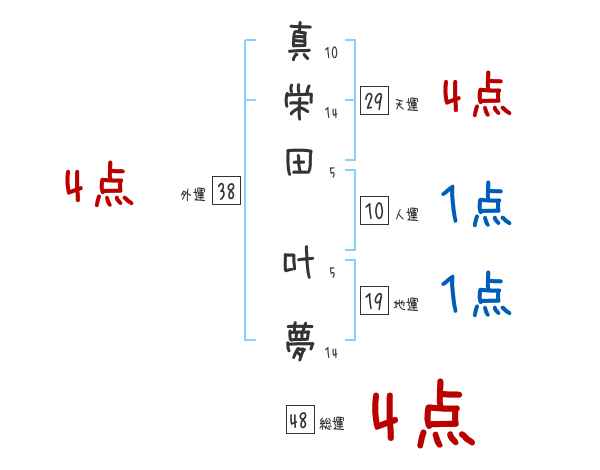 外運![]() | 真栄田叶夢さんの外運は38画の4つ星!温厚な性格で技術的な才能を発揮する。職人的な仕事に向いている。 生活面を象徴する運勢です。外部から受ける影響力を表し、結婚運、家庭運や職場、環境への順応性を表します。 |
