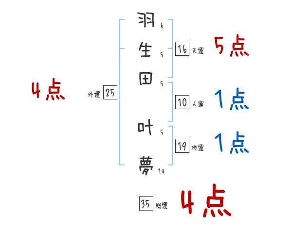 天運![]() | 羽生田叶夢さんの天運は16画の5つ星!人望が厚く大きく発展する。逆転成功が見える。 家系が持つ宿命的な運勢を表します。祖先から受け継いだ苗字ですので自分の力が及びません。家柄を象徴します。 |
