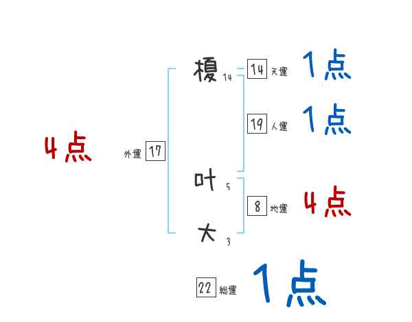 外運![]() | 榎叶大さんの外運は17画の4つ星!積極的な行動力。地位を気づき財産を手に入れる。純粋な心と直感力。 生活面を象徴する運勢です。外部から受ける影響力を表し、結婚運、家庭運や職場、環境への順応性を表します。 |