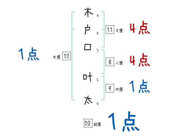 天運![]() | 木戸口叶太さんの天運は11画の4つ星!着実に富や地位を得る幸運な人生。 家系が持つ宿命的な運勢を表します。祖先から受け継いだ苗字ですので自分の力が及びません。家柄を象徴します。 |