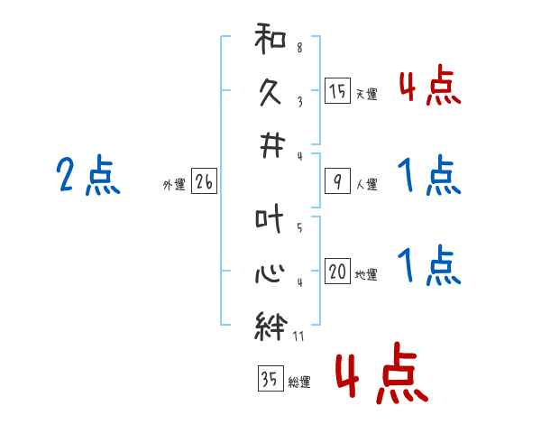 総運![]() | 和久井叶心絆さんの総運は35画の4つ星!温厚な性格で感受性が高い。穏和な性格で人望が厚い。 あなたの人生を表す1番重要な運勢です。生涯を通じて影響する総合運となり、主に50歳以降の晩年期に影響を及ぼします。 |