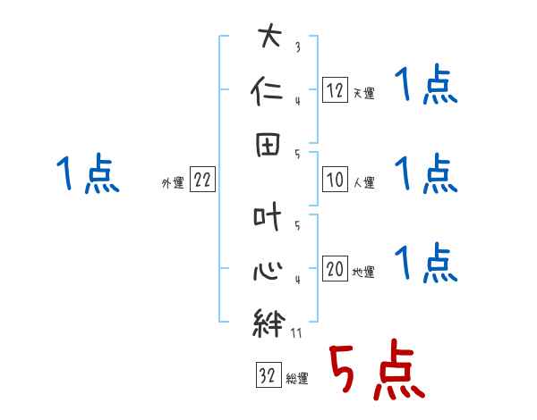 天運![]() | 大仁田叶心絆さんの天運は12画の1つ星!簡単な失敗で諦めてしまいやすいかも。着実に行動すると良いでしょう。 家系が持つ宿命的な運勢を表します。祖先から受け継いだ苗字ですので自分の力が及びません。家柄を象徴します。 |
