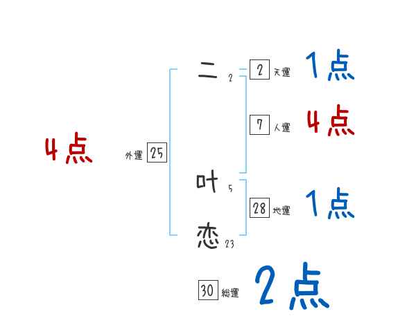 天運![]() | 二叶恋さんの天運は2画の1つ星!優しいですが積極性や意思の強さに欠ける傾向があります。家庭環境の乱れに注意しましょう。 家系が持つ宿命的な運勢を表します。祖先から受け継いだ苗字ですので自分の力が及びません。家柄を象徴します。 |