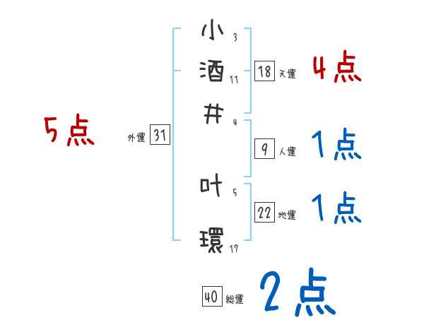 天運![]() | 小酒井叶環さんの天運は18画の4つ星!情熱的で剛気。忍耐力があり信頼される。 家系が持つ宿命的な運勢を表します。祖先から受け継いだ苗字ですので自分の力が及びません。家柄を象徴します。 |