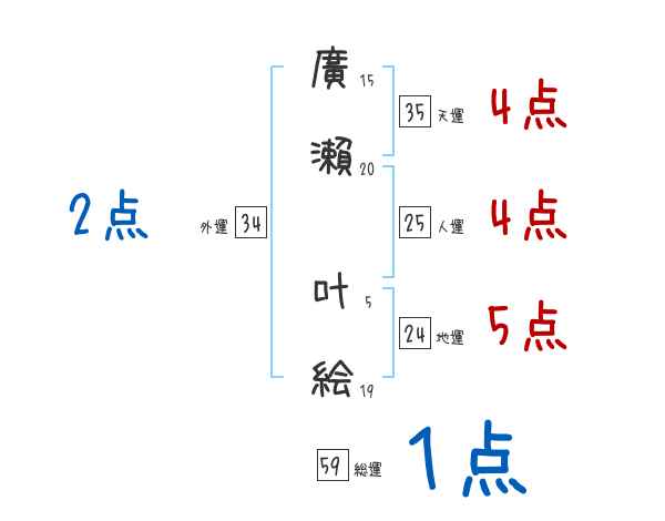 天運![]() | 廣瀨叶絵さんの天運は35画の4つ星!温厚な性格で感受性が高い。穏和な性格で人望が厚い。 家系が持つ宿命的な運勢を表します。祖先から受け継いだ苗字ですので自分の力が及びません。家柄を象徴します。 |