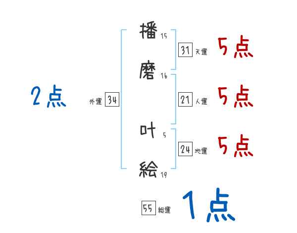 人運![]() | 播磨叶絵さんの人運は21画の5つ星!統率力がある。独立し成功する。名誉を手に入れる。 性格や才能などを表す2番目に重要な運勢です。人間関係や協調性、社会的な成功に影響します。主に20歳から50歳ぐらいまでの中年期の運勢を表します。 |