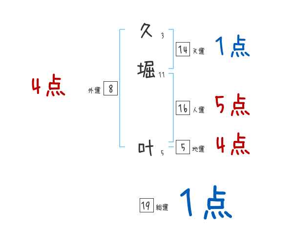 人運![]() | 久堀叶さんの人運は16画の5つ星!人望が厚く大きく発展する。逆転成功が見える。 性格や才能などを表す2番目に重要な運勢です。人間関係や協調性、社会的な成功に影響します。主に20歳から50歳ぐらいまでの中年期の運勢を表します。 |