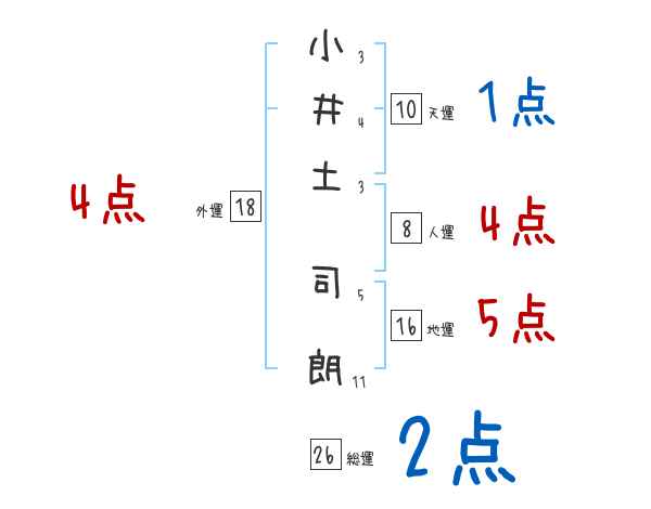 外運![]() | 小井土司朗さんの外運は18画の4つ星!情熱的で剛気。忍耐力があり信頼される。 生活面を象徴する運勢です。外部から受ける影響力を表し、結婚運、家庭運や職場、環境への順応性を表します。 |