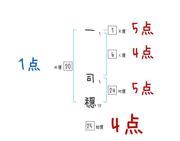天運![]() | 一司穏さんの天運は1画の5つ星!行動力、指導力があり出世し繁栄する。幸運に恵まれる。 家系が持つ宿命的な運勢を表します。祖先から受け継いだ苗字ですので自分の力が及びません。家柄を象徴します。 |