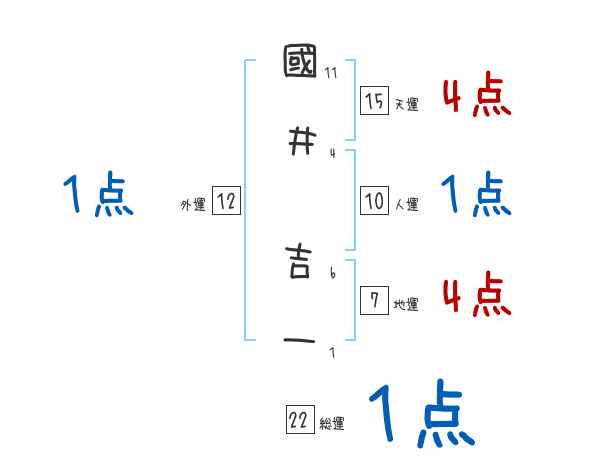 総運![]() | 國井吉一さんの総運は22画の1つ星!努力することが苦手ないっぽう手先が器用。芸術性にも優れる。 あなたの人生を表す1番重要な運勢です。生涯を通じて影響する総合運となり、主に50歳以降の晩年期に影響を及ぼします。 |