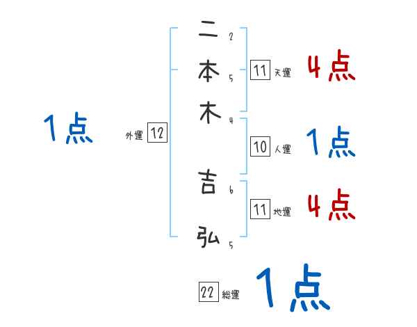 総運![]() | 二本木吉弘さんの総運は22画の1つ星!努力することが苦手ないっぽう手先が器用。芸術性にも優れる。 あなたの人生を表す1番重要な運勢です。生涯を通じて影響する総合運となり、主に50歳以降の晩年期に影響を及ぼします。 |