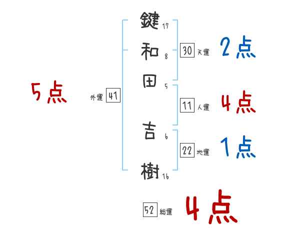総運![]() | 鍵和田吉樹さんの総運は52画の4つ星!先見性と独創性に優れ考える力がある。強運の持ち主。 あなたの人生を表す1番重要な運勢です。生涯を通じて影響する総合運となり、主に50歳以降の晩年期に影響を及ぼします。 |