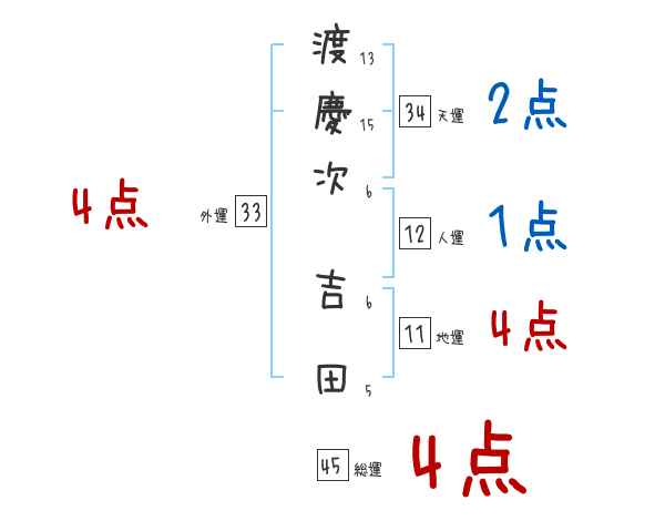 天運![]() | 渡慶次吉田さんの天運は34画の2つ星!独創性に優れるが、自尊心が強く災難に注意しましょう。 家系が持つ宿命的な運勢を表します。祖先から受け継いだ苗字ですので自分の力が及びません。家柄を象徴します。 |