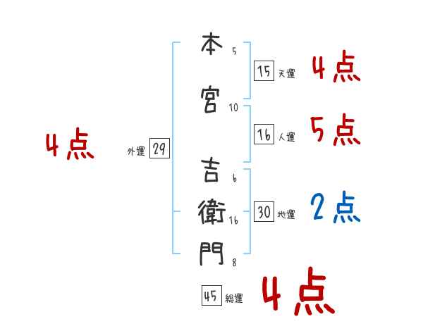 人運![]() | 本宮吉衛門さんの人運は16画の5つ星!人望が厚く大きく発展する。逆転成功が見える。 性格や才能などを表す2番目に重要な運勢です。人間関係や協調性、社会的な成功に影響します。主に20歳から50歳ぐらいまでの中年期の運勢を表します。 |