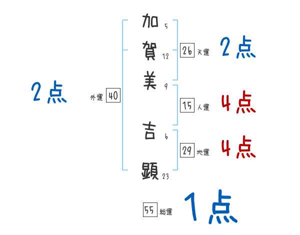 天運![]() | 加賀美吉顕さんの天運は26画の2つ星!波瀾万丈かも。信頼できる人を大事にしましょう。 家系が持つ宿命的な運勢を表します。祖先から受け継いだ苗字ですので自分の力が及びません。家柄を象徴します。 |