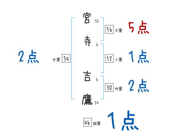 外運![]() | 宮寺吉鷹さんの外運は34画の2つ星!独創性に優れるが、自尊心が強く災難に注意しましょう。 生活面を象徴する運勢です。外部から受ける影響力を表し、結婚運、家庭運や職場、環境への順応性を表します。 |