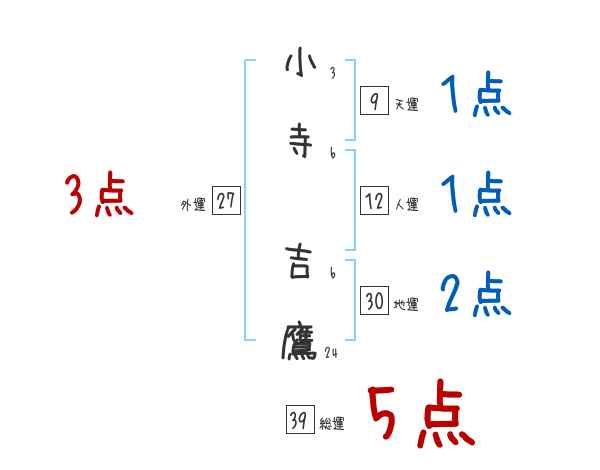 総運![]() | 小寺吉鷹さんの総運は39画の5つ星!社交性に優れ人望が厚い。人の上に立ち成功する。 あなたの人生を表す1番重要な運勢です。生涯を通じて影響する総合運となり、主に50歳以降の晩年期に影響を及ぼします。 |
