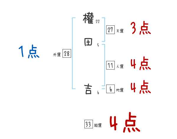 総運![]() | 權田吉さんの総運は33画の4つ星!権力志向でプライドが高い。勇気があり運を切り開き成功する。 あなたの人生を表す1番重要な運勢です。生涯を通じて影響する総合運となり、主に50歳以降の晩年期に影響を及ぼします。 |