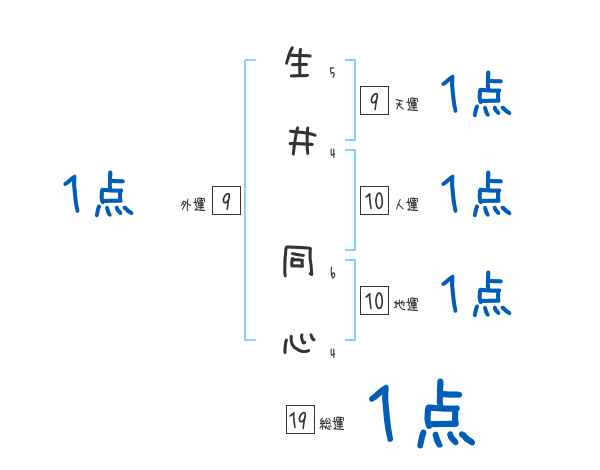 天運![]() | 生井同心さんの天運は9画の1つ星!消極的で才能を発揮することが苦手なことも。周りの意見に耳を傾けましょう。 家系が持つ宿命的な運勢を表します。祖先から受け継いだ苗字ですので自分の力が及びません。家柄を象徴します。 |
