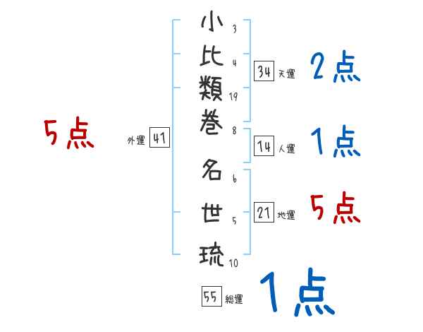 総運![]() | 小比類巻名世琉さんの総運は55画の1つ星!欲張りな性格で軽率な行動に注意しましょう。病気に気をつけて。 あなたの人生を表す1番重要な運勢です。生涯を通じて影響する総合運となり、主に50歳以降の晩年期に影響を及ぼします。 |