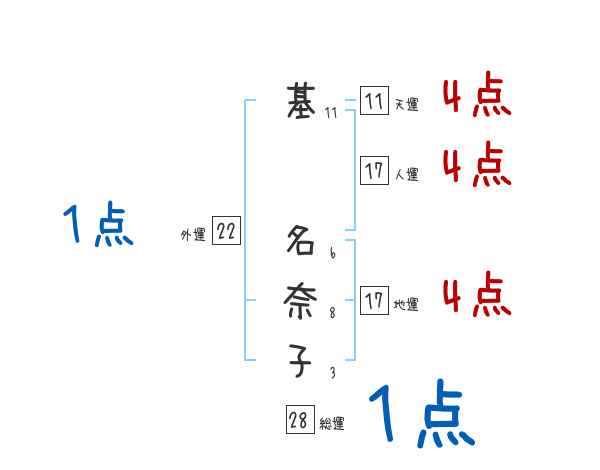 天運![]() | 基名奈子さんの天運は11画の4つ星!着実に富や地位を得る幸運な人生。 家系が持つ宿命的な運勢を表します。祖先から受け継いだ苗字ですので自分の力が及びません。家柄を象徴します。 |