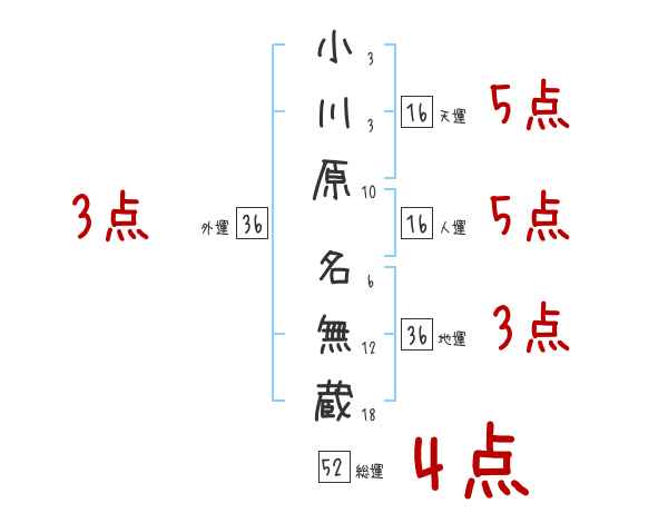 人運![]() | 小川原名無蔵さんの人運は16画の5つ星!人望が厚く大きく発展する。逆転成功が見える。 性格や才能などを表す2番目に重要な運勢です。人間関係や協調性、社会的な成功に影響します。主に20歳から50歳ぐらいまでの中年期の運勢を表します。 |