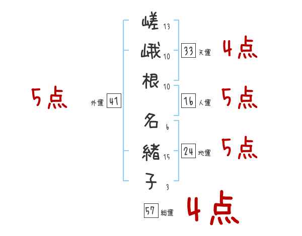 天運![]() | 嵯峨根名緒子さんの天運は33画の4つ星!権力志向でプライドが高い。勇気があり運を切り開き成功する。 家系が持つ宿命的な運勢を表します。祖先から受け継いだ苗字ですので自分の力が及びません。家柄を象徴します。 |