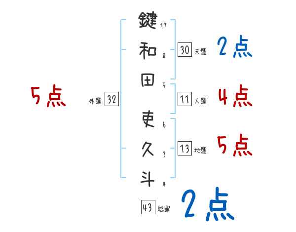 外運![]() | 鍵和田吏久斗さんの外運は32画の5つ星!柔軟性があり成功する。チャンスが多く金運が良い。 生活面を象徴する運勢です。外部から受ける影響力を表し、結婚運、家庭運や職場、環境への順応性を表します。 |