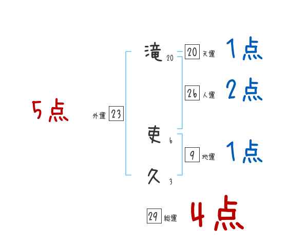 外運![]() | 滝吏久さんの外運は23画の5つ星!想像力に優れ活力がある。一代で成功し名誉を手に入れる。 生活面を象徴する運勢です。外部から受ける影響力を表し、結婚運、家庭運や職場、環境への順応性を表します。 |
