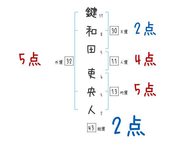 外運![]() | 鍵和田吏央人さんの外運は32画の5つ星!柔軟性があり成功する。チャンスが多く金運が良い。 生活面を象徴する運勢です。外部から受ける影響力を表し、結婚運、家庭運や職場、環境への順応性を表します。 |