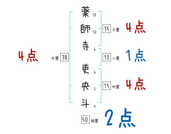 | 天運  | 薬師寺吏央斗さんの天運は35画の4つ星!温厚な性格で感受性が高い。穏和な性格で人望が厚い。家系が持つ宿命的な運勢を表します。祖先から受け継いだ苗字ですので自分の力が及びません。家柄を象徴します。 |