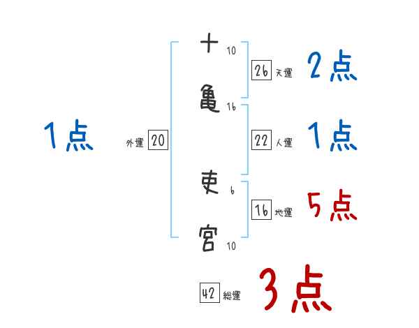 天運![]() | 十亀吏宮さんの天運は26画の2つ星!波瀾万丈かも。信頼できる人を大事にしましょう。 家系が持つ宿命的な運勢を表します。祖先から受け継いだ苗字ですので自分の力が及びません。家柄を象徴します。 |