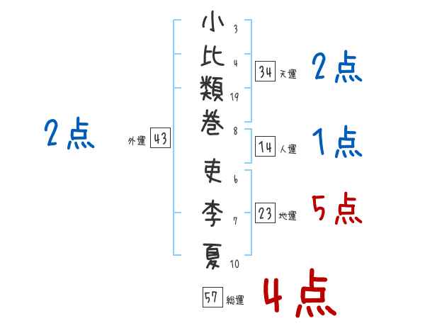 天運![]() | 小比類巻吏李夏さんの天運は34画の2つ星!独創性に優れるが、自尊心が強く災難に注意しましょう。 家系が持つ宿命的な運勢を表します。祖先から受け継いだ苗字ですので自分の力が及びません。家柄を象徴します。 |