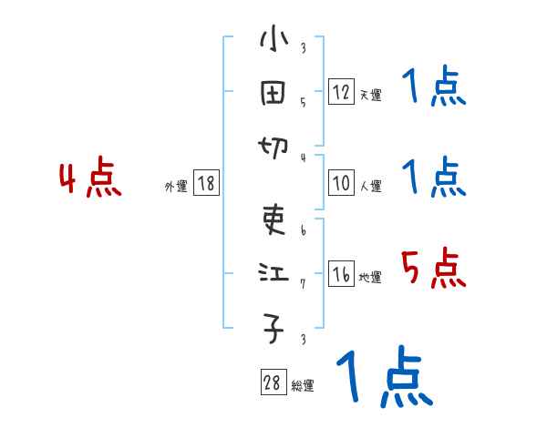外運![]() | 小田切吏江子さんの外運は18画の4つ星!情熱的で剛気。忍耐力があり信頼される。 生活面を象徴する運勢です。外部から受ける影響力を表し、結婚運、家庭運や職場、環境への順応性を表します。 |