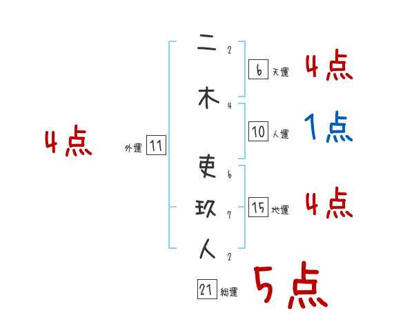 人運![]() | 二木吏玖人さんの人運は10画の1つ星!不安を感じやすい傾向。ストレスを抱えないように注意しましょう。 性格や才能などを表す2番目に重要な運勢です。人間関係や協調性、社会的な成功に影響します。主に20歳から50歳ぐらいまでの中年期の運勢を表します。 |