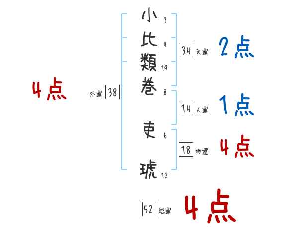外運![]() | 小比類巻吏琥さんの外運は38画の4つ星!温厚な性格で技術的な才能を発揮する。職人的な仕事に向いている。 生活面を象徴する運勢です。外部から受ける影響力を表し、結婚運、家庭運や職場、環境への順応性を表します。 |