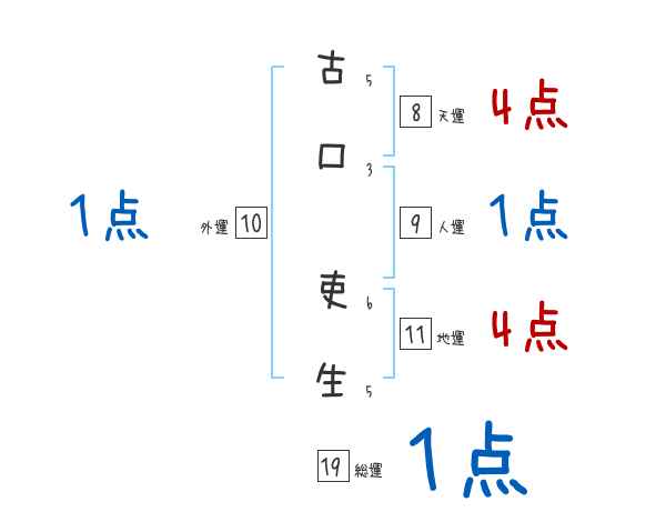 天運![]() | 古口吏生さんの天運は8画の4つ星!勤勉家。根気強く努力し成功する。忍耐力がある。 家系が持つ宿命的な運勢を表します。祖先から受け継いだ苗字ですので自分の力が及びません。家柄を象徴します。 |