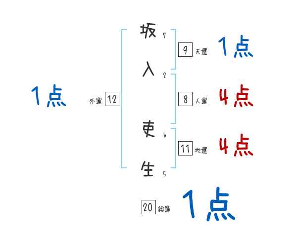 天運![]() | 坂入吏生さんの天運は9画の1つ星!消極的で才能を発揮することが苦手なことも。周りの意見に耳を傾けましょう。 家系が持つ宿命的な運勢を表します。祖先から受け継いだ苗字ですので自分の力が及びません。家柄を象徴します。 |
