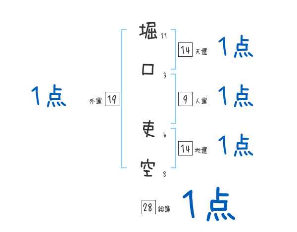 外運![]() | 堀口吏空さんの外運は19画の1つ星!優れた才能を持ちますが、協調性が足りないことも。周りの人と協力する事を意識しましょう。 生活面を象徴する運勢です。外部から受ける影響力を表し、結婚運、家庭運や職場、環境への順応性を表します。 |