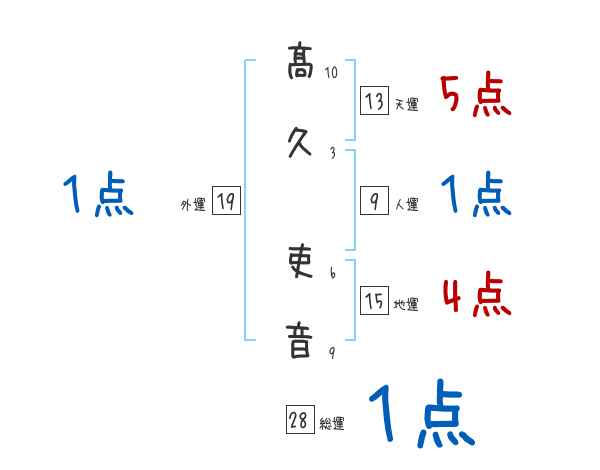 天運![]() | 髙久吏音さんの天運は13画の5つ星!才能に恵まれ人気がある。名声を手に入れる。円満な人生。 家系が持つ宿命的な運勢を表します。祖先から受け継いだ苗字ですので自分の力が及びません。家柄を象徴します。 |
