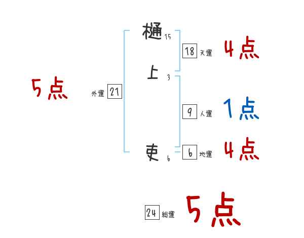 外運![]() | 樋上吏さんの外運は21画の5つ星!統率力がある。独立し成功する。名誉を手に入れる。 生活面を象徴する運勢です。外部から受ける影響力を表し、結婚運、家庭運や職場、環境への順応性を表します。 |