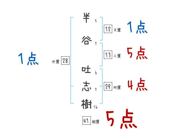 外運![]() | 半谷吐志樹さんの外運は28画の1つ星!家庭環境に注意。スポーツで活躍できる能力があるかも。 生活面を象徴する運勢です。外部から受ける影響力を表し、結婚運、家庭運や職場、環境への順応性を表します。 |