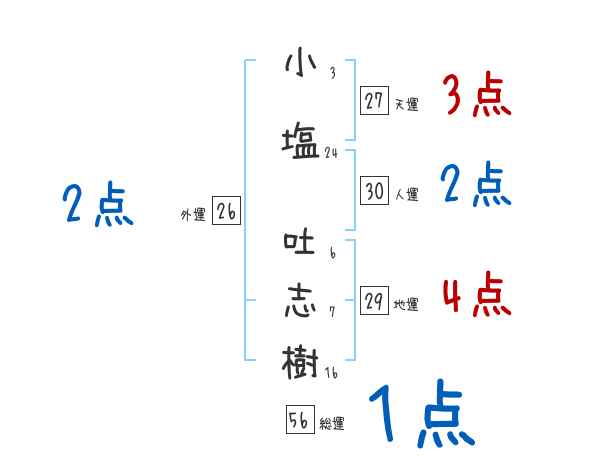 天運![]() | 小塩吐志樹さんの天運は27画の3つ星!頭脳明晰だが強情で摩擦が多い傾向。孤立に注意。 家系が持つ宿命的な運勢を表します。祖先から受け継いだ苗字ですので自分の力が及びません。家柄を象徴します。 |