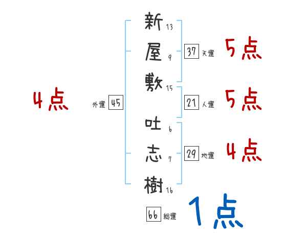 天運![]() | 新屋敷吐志樹さんの天運は37画の5つ星!努力家で順応性に優れる。現実的な考え方ができ忠実に物事をこなす。 家系が持つ宿命的な運勢を表します。祖先から受け継いだ苗字ですので自分の力が及びません。家柄を象徴します。 |