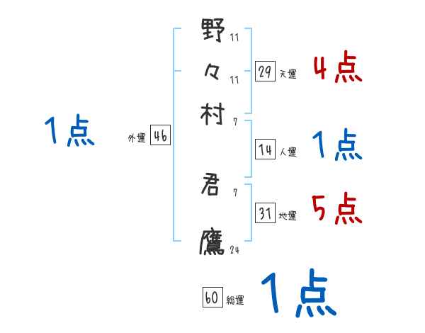天運![]() | 野々村君鷹さんの天運は29画の4つ星!完全主義で才能がある。厳格な心の持ち主。 家系が持つ宿命的な運勢を表します。祖先から受け継いだ苗字ですので自分の力が及びません。家柄を象徴します。 |
